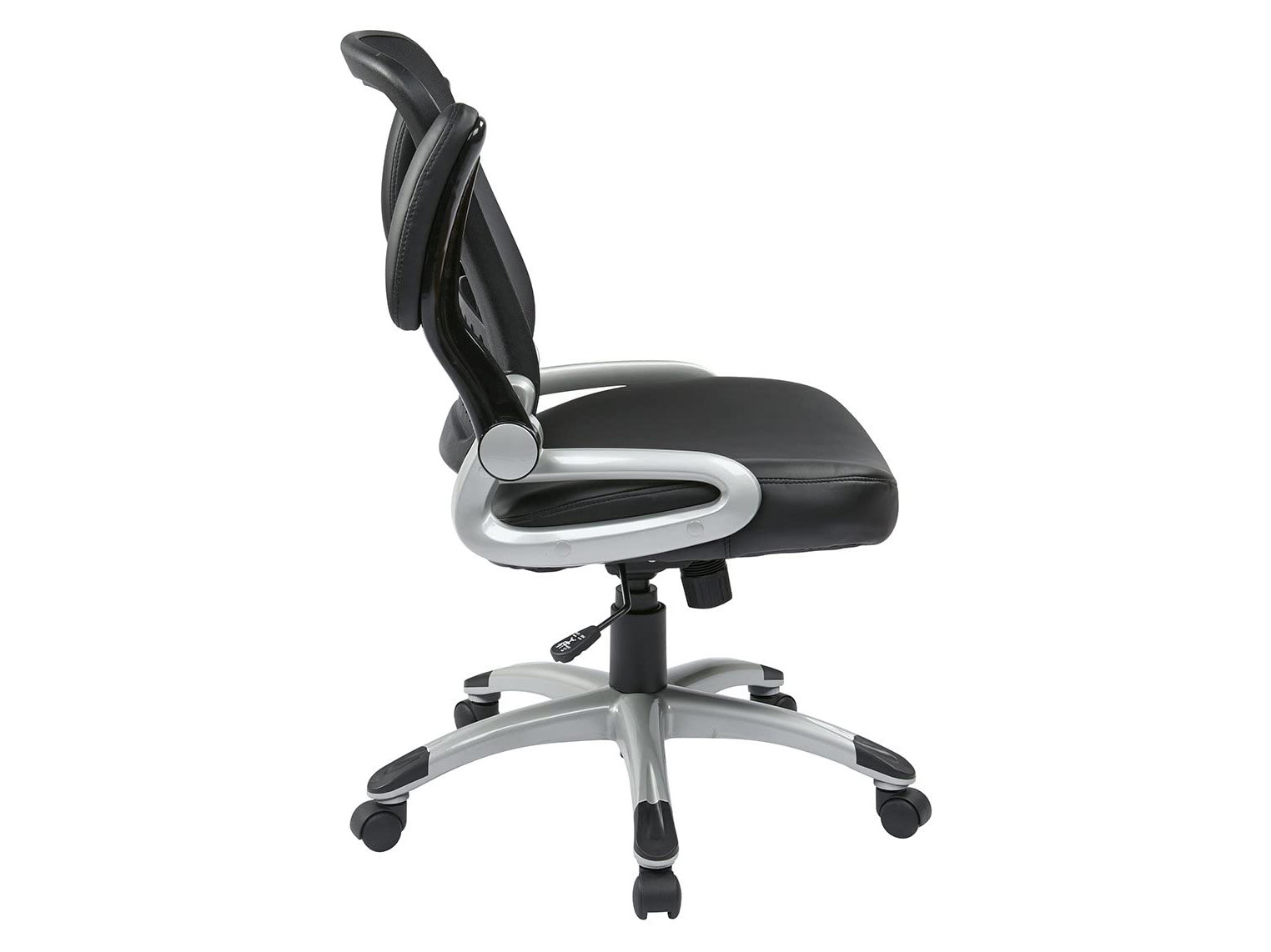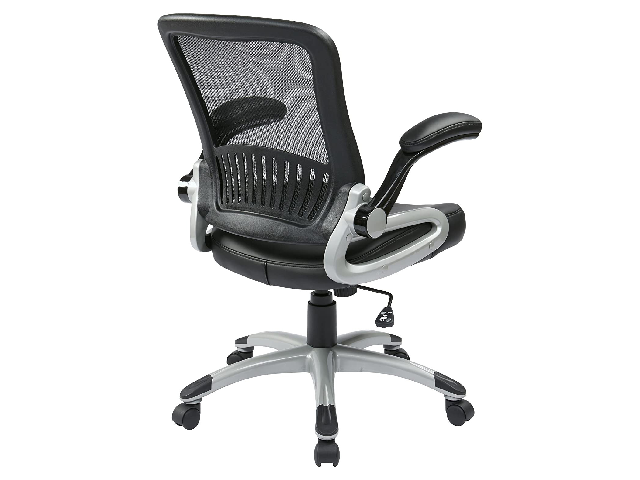 This task chair is a step ahead of the rest with the adjustable, flip arm design and the pneumatic gas lift that allows for easy height adjustments. Comfort reigns supreme with the mesh back design and an antimicrobial vinyl seat. It comes standard with a spring tilt mechanism, tilt tension control, and an upright lock. It also features a 27-inch nylon base with 2-inch nylon dual-wheel casters for a smooth roll and a weight limit of 275 lbs.