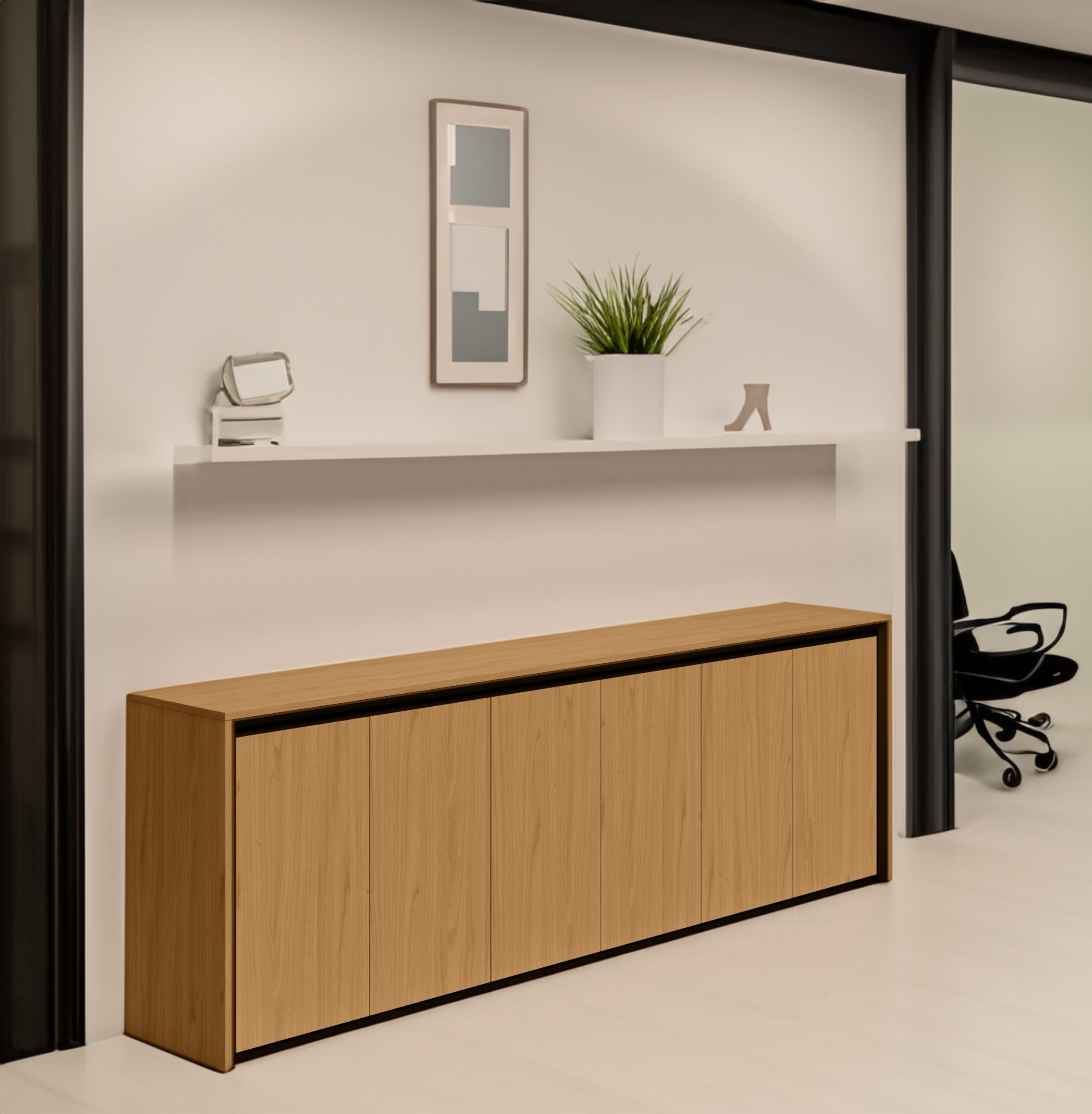 “Enhance your workspace with the BT22 Cabinet 6-Door Short, a sleek and modern storage solution. Measuring 94 x 16 x 31 inches, this cabinet features a sophisticated walnut finish with black accents, adding a contemporary touch to any office or home setting. Designed for both style and functionality, it offers ample storage space to keep your essentials organized while complementing modern interiors. Perfect for professional and personal spaces alike!”